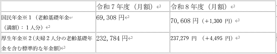 これを踏まえ、令和8年度の年金額は、法律の規定に基づき、下記の通りとなります。
