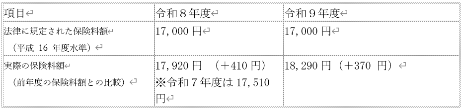 実際の保険料額は、平成16年度水準を維持するため、国民年金法第87条第3項の規定により、名目賃金の変動に応じて毎年度改定され、令和9年度の保険料額は以下の通りとなります。